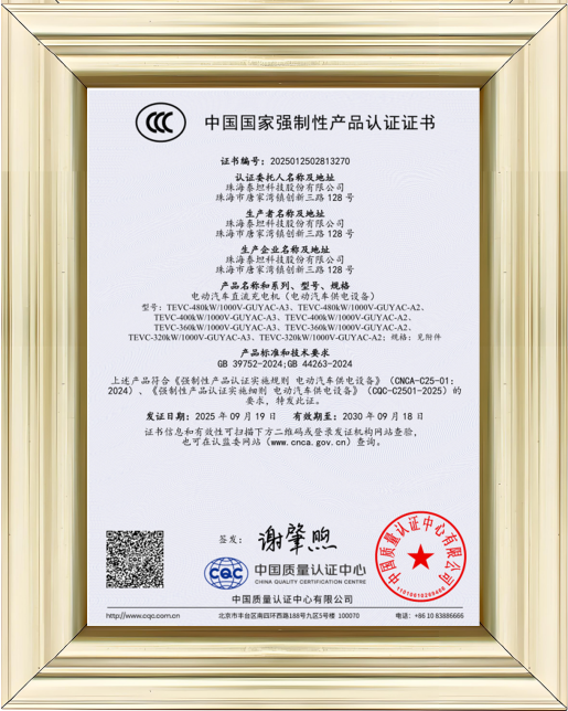 隨著電動汽車產業的快速發展,市場對充電產品提出了更高要求。泰坦始終將產品質量視為企業生命線,從研發設計到生產制造,均嚴格按照國家及行業標準執行。此次成功通過CCC認證,不僅是權威機構對泰坦充電產品的充分肯定,更是對泰坦品牌的認可。未來,泰坦將持續加碼研發投入,推動行業技術迭代,與行業伙伴一起,共建安全、高效、可靠的充電生態,為新能源汽車普及與綠色低碳發展注入強勁動能。